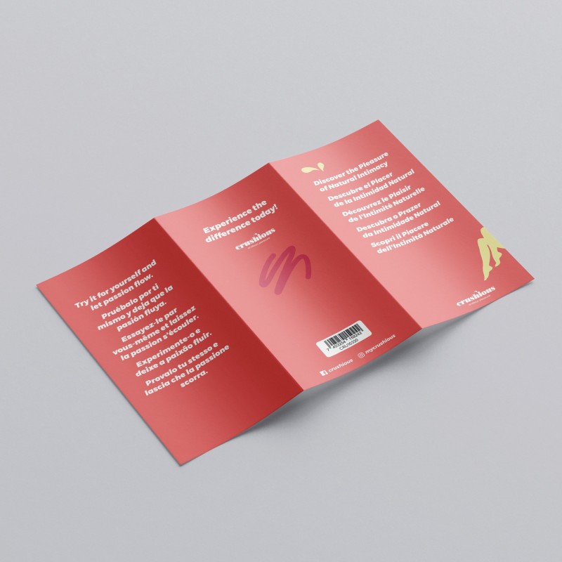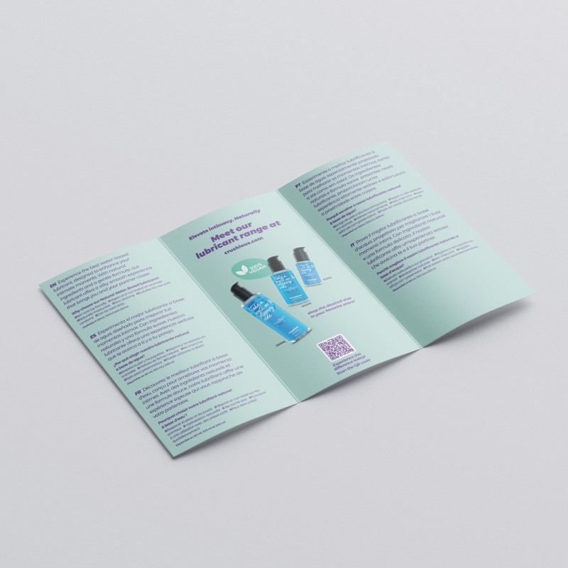 Folheto com amostra do lubrificante à base de água Crushious e informações sobre o produto em 5 idiomas. Inglês, espanhol, francês, português e italiano.