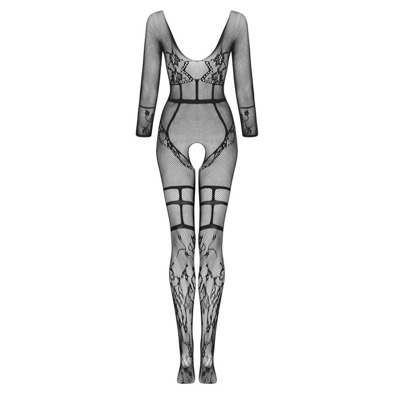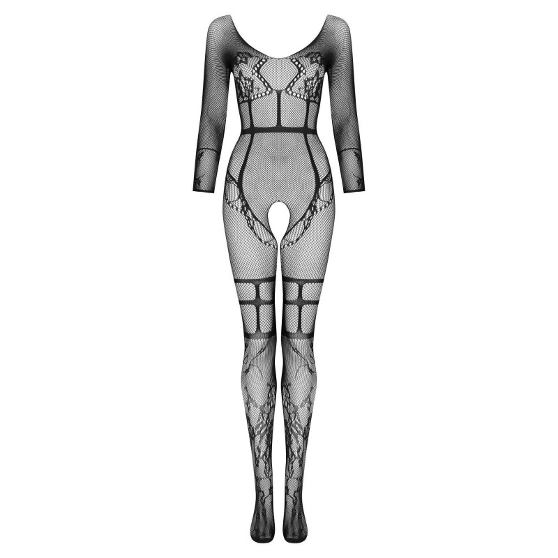 Um catsuit super sexy para os amantes de roupa interior confortável, feito de fio preto e delicado. O motivo em rede é complementado por impressionantes aplicações florais e tiras na cintura e nas coxas.