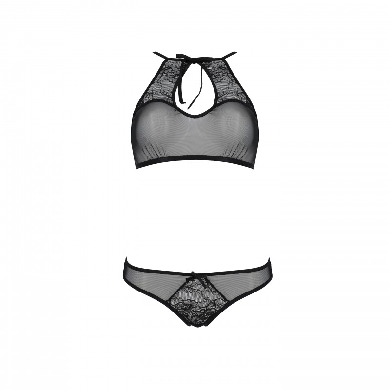 O sutiã, com copas em renda delicada, realça o decote, enquanto as alças ajustáveis garantem um ajuste perfeito e confortável. A tanga aberta entre as pernas realça as curvas femininas com detalhes em renda, conferindo um toque de sensualidade e elegância.