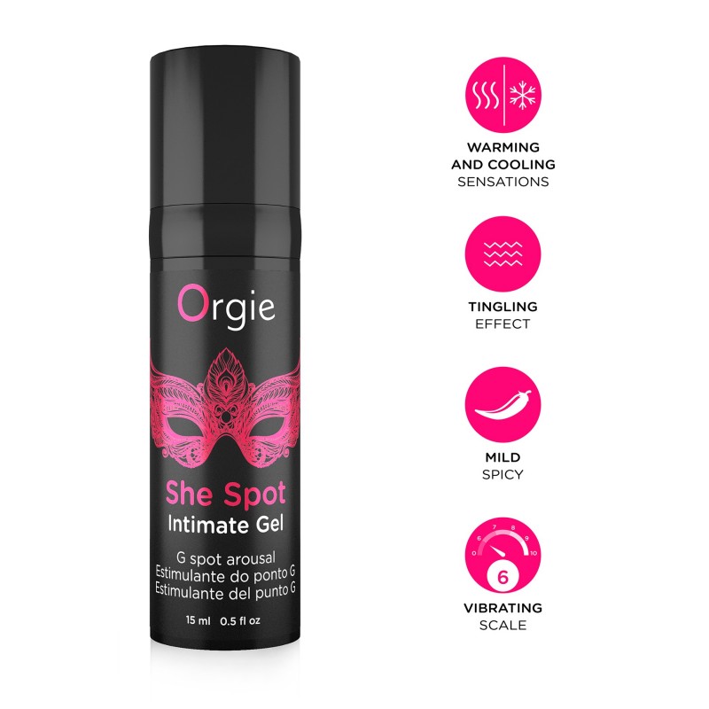 She Spot tem ingredientes ativos na sua fórmula que estimulam a área do ponto G, tornando-a ainda mais sensível. É um gel íntimo estimulante para ela que pode ser partilhado por casais devido às suas características. Efeito vibrante e formigante intenso instantâneo com sensações evolutivas de aquecimento, arrefecimento e leve picante durante o seu tempo de ação.