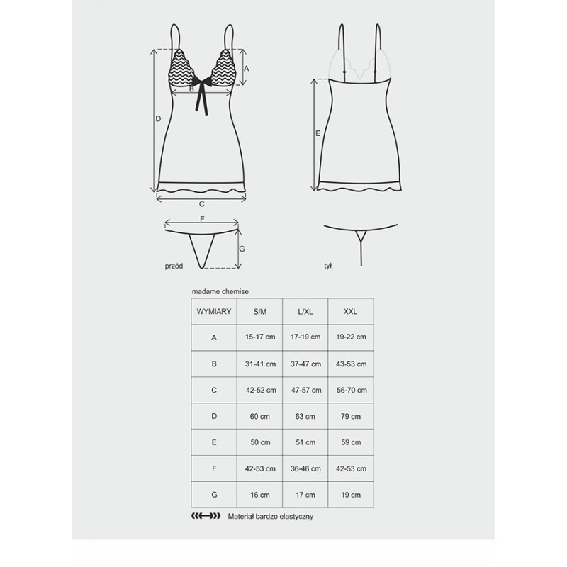 Explore your night and seduce with this chemise. Easy to seduce and conquer with the light clearness of this soft and fresh fabric. A satin bow in the middle of the neckline, and lace frills in the breasts and at the bottom. Including a matching thong. This is a product from OBSESSIVE, a leading brand filled with eroticism and sensuality with unique models that highlight the women body even more.