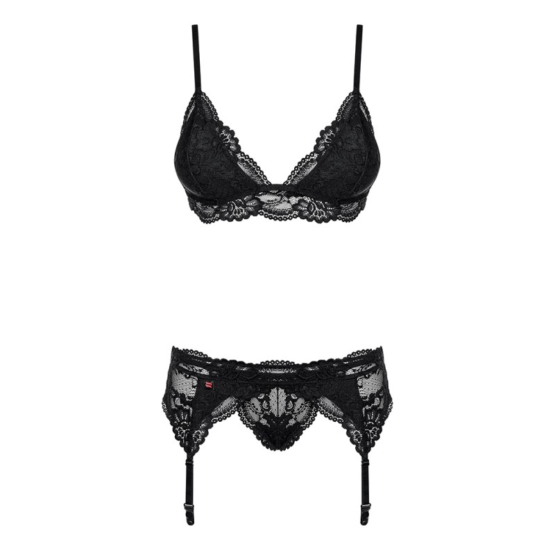 Feel comfortably irresistible with this set made of, padded bra, thong and garter belt. Its cut makes it embrace your curves vertiginously and the embroidered lace gives them a pinch of boldness.