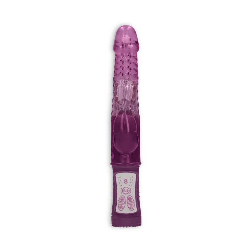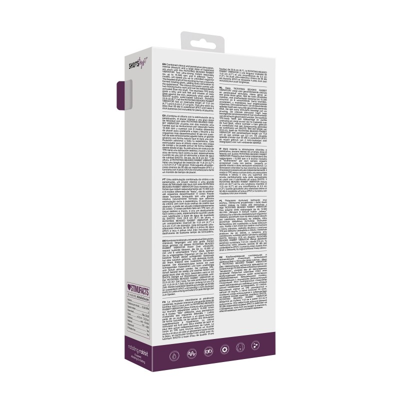Combined clitoral and penetrative stimulation, intense pleasure and a large dose of happiness are yours with this ROTATING BEADED RABBIT VIBRATOR! Two ultra-strong motors separately rev up to 15.500 rpm and 8 different party" modes, will speed you up to unbridled orgasms! The beaded shaft of this exciting toy has a naturally formed rotating glans, adding extra stimulation to the experience. The clitoral stimulator comes with two flicking bunny ears and can be independently activated from the shaft. The seamless TPE body gives a silky and soft feel and creates an easy glide against the skin. This ultra-silent toy (less than 50 db) is waterproof (IPX7) and takes 4 AAA batteries (not included) for plenty of playtime.