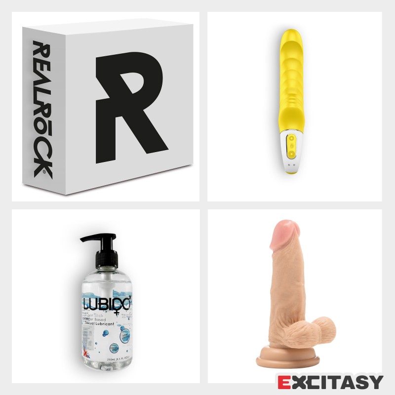 Pack consisting of rechargeable vibrator, realistic dildo with suction cup, and a waterbased lubricant with dispenser. Everything presented in a closed box.