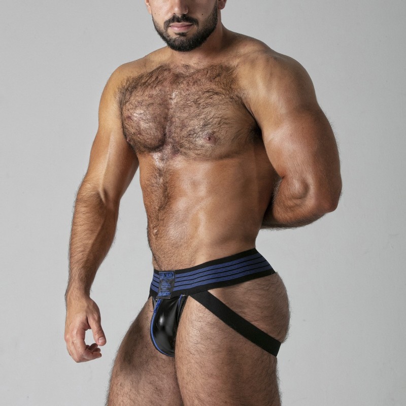 Jockstrap with functional zipper, made of the finest leatherette fabric.