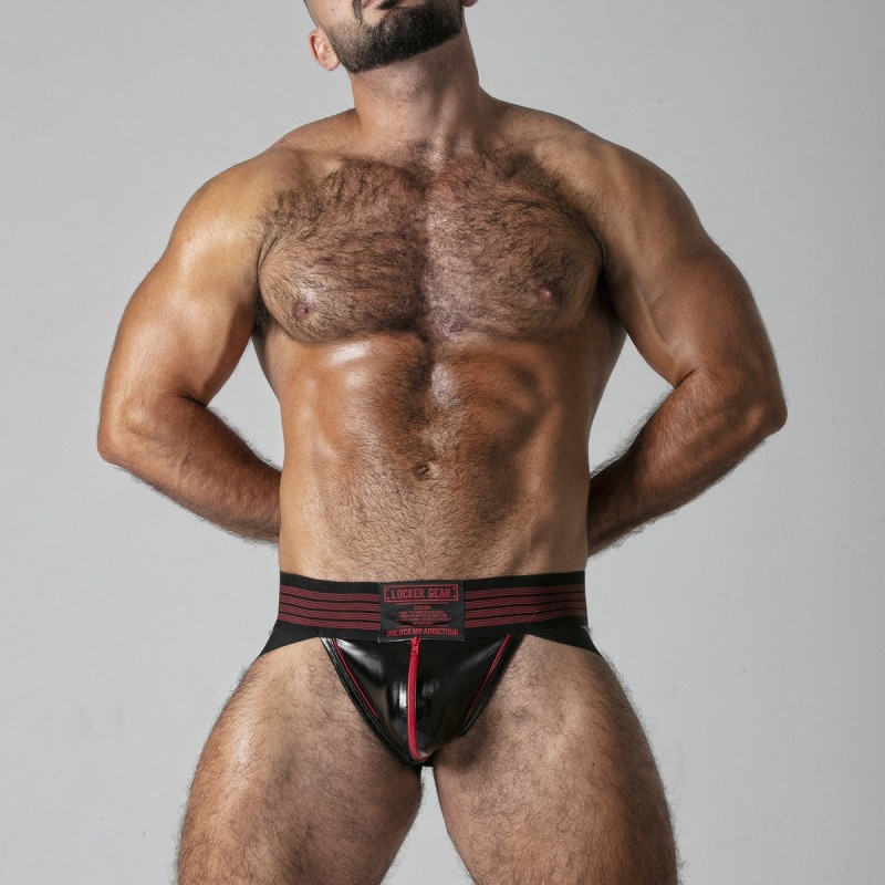 Jockstrap with functional zipper, made of the finest leatherette fabric.