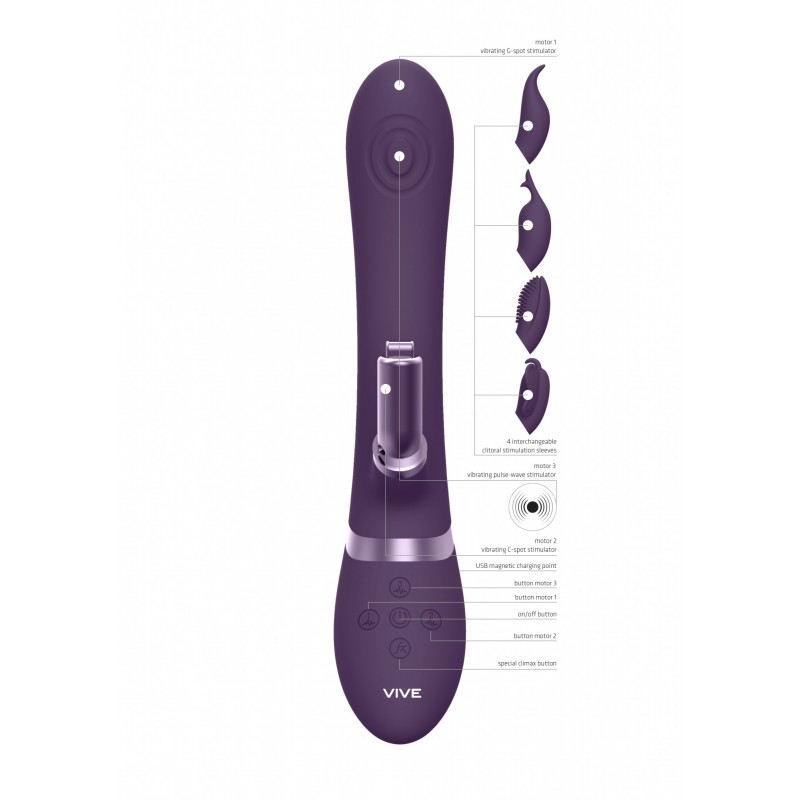 Made from 100% silky smooth medical-grade silicone (hypoallergenic), it is totally waterproof (IPX7), and extremely quiet at under 60db. This means you can use it wherever your heart desires! It contains a USB magnetic rechargeable lithium-ion battery, that when fully charged with its USB cable, it will provide 40 minutes of passionate playtime.ÂJust plug, charge and play! When you're getting close to climax, just one-touch of the special function climax button will immediately bring all the motors to full power and, more importantly, bring you to an earth-shattering orgasm. All VIVE Vibrators have a full 1-year warranty to protect your investment.