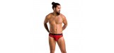 Square-cut back opening briefs made of perforated synthetic leather.