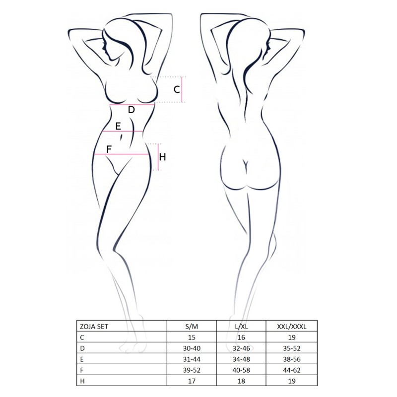 The Zoja by Passion set is a sophisticated and sensual lingerie set comprising a bra with underwires, a garter belt and a thong.