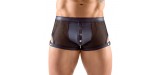 Svenjoyment's striking black mesh shorts have a row of eye-catching press studs over the matt-looking opaque pouch.