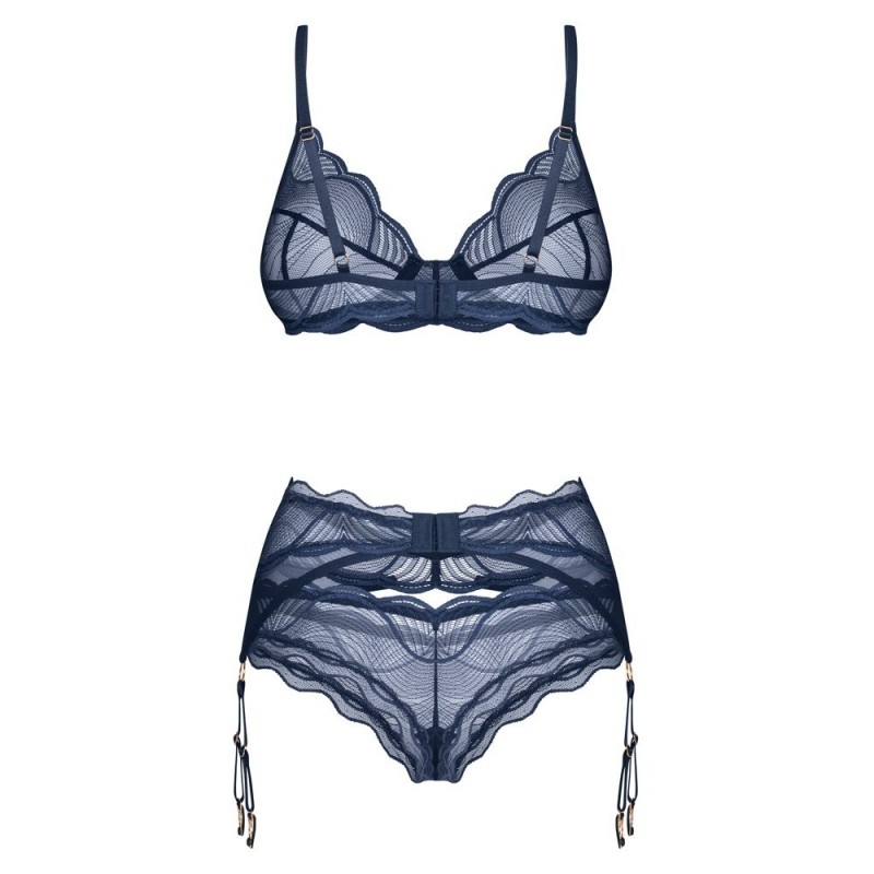 An elegant and sensual set! Obsessive's transparent Nightly Blue set includes an underwired bra, a garter belt and a string.