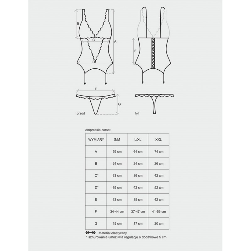 Elegant corset made of soft and sheer material, with cups and center decorated by velvet floral motifs. It also has lace details and adjustable garters. Includes a matching thong. This is a product from OBSESSIVE, a leading brand filled with eroticism and sensuality with unique models that highlight the women body even more.