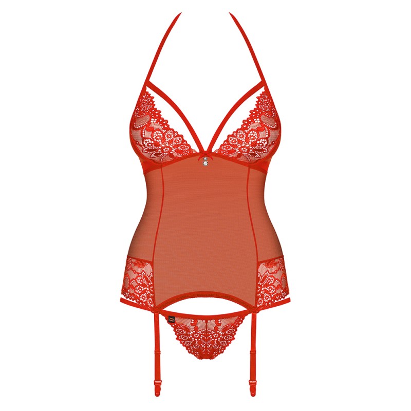 Siéntase irresistiblemente romántica con este corset con tanga a juego. Hecho en encaje elastico, con bordado floral con pendientes brillantes. Vista sensualidad y originalidad, dejándolo loco de deseo. Este producto es de la marca OBSESSIVE, una marca líder, llena de erotismo y sensualidad con modelos únicos que enaltecen aún más el cuerpo de las mujeres.