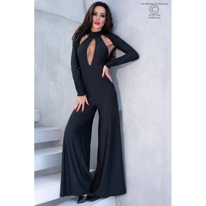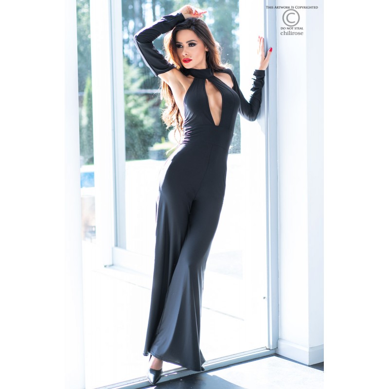 Precioso mono confeccionado en suave tejido elástico negro de alta calidad con espalda abierta, escote frontal profundo y manga larga que cubre solo los hombros, creando un efecto bolero. Pantalón ancho y ata por detrás del cuello.