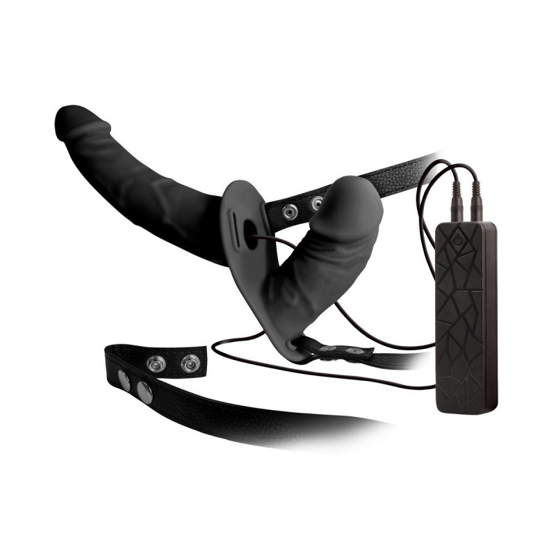 Vibrador negro con correa, con vibrador grande en el exterior y pequeño en el interior. El vibrador grande está ligeramente curvado y sirve para la penetración de la parte pasiva, el vibrador pequeño sirve para la penetración propia (parte activa).