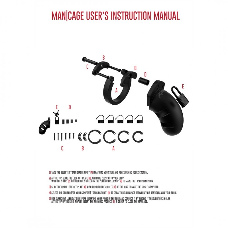 La jaula va acompañada de cinco anillos de diferentes tamaños y espaciadores ajustables, que se adaptan con precisión a diversos tipos de anatomía. Su diseño ergonómico evita las erecciones, favoreciendo una intensa acumulación de deseo hasta el momento liberador de la extracción.