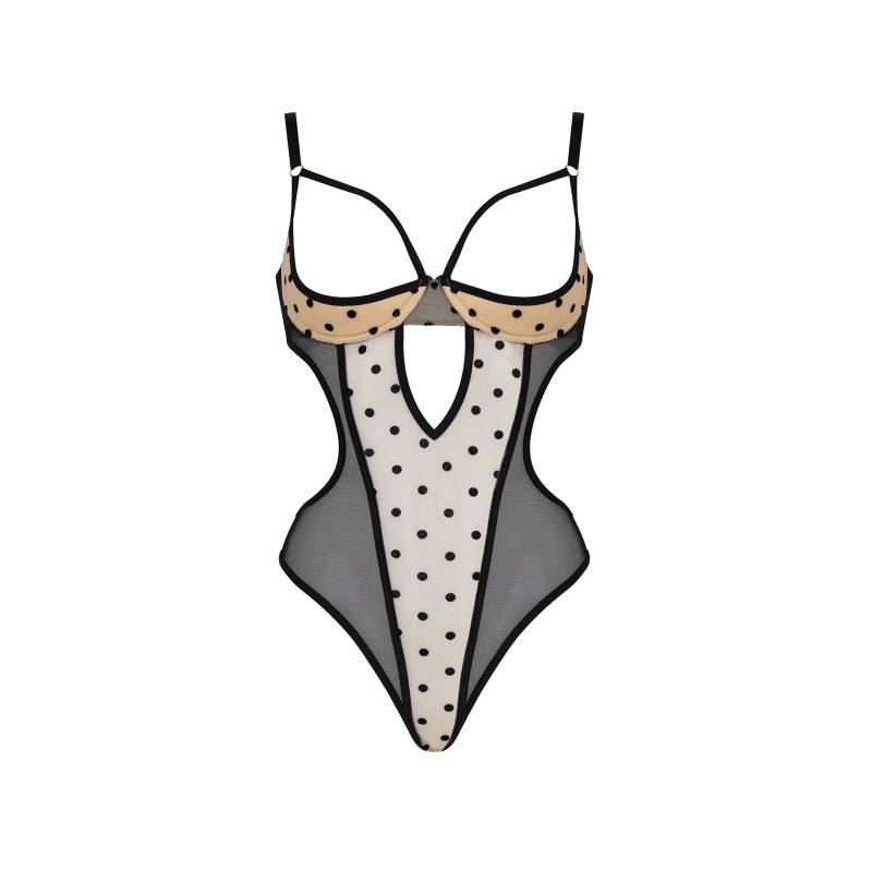 Los recortes estratégicos del body están diseñados para moldear y estilizar la silueta, ofreciendo un aspecto aún más esbelto y sensual. Para añadir un toque de delicadeza, unos encantadores puntos bordados confieren a la prenda un brillo sutil y encantador.