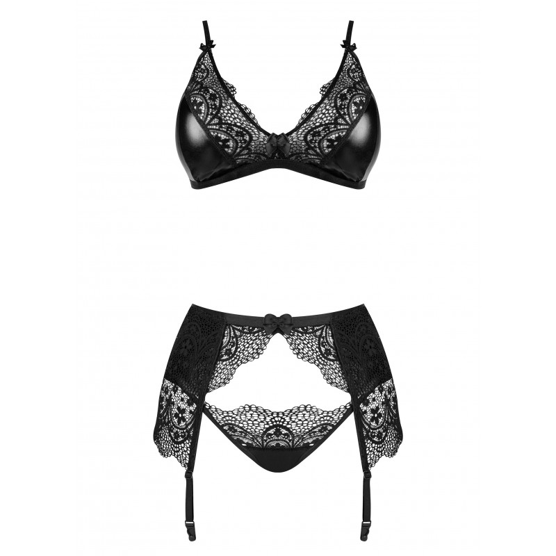 El exclusivo conjunto de lencería Obsidian Desire está diseñado para mujeres que valoran la sensualidad y la elegancia. La combinación de material wetlook y detalles de encaje le confiere un carácter único, mientras que los atrevidos cortes y el excepcional diseño hacen que cada mujer se sienta especial.