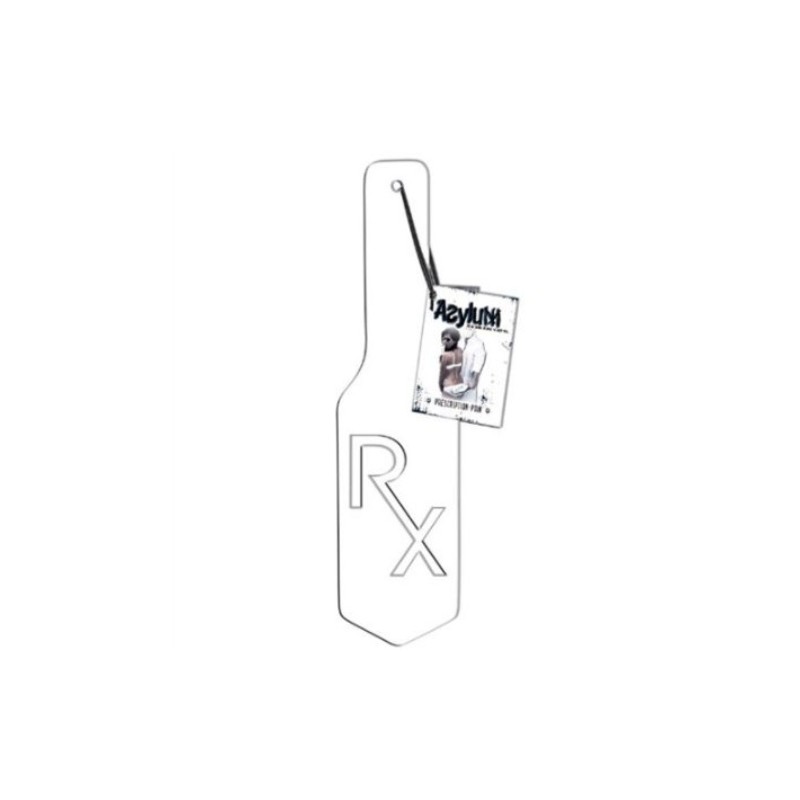 El azotador PRESCRIPTION PAIN no está hecho de cuero o cuero sintético, pero de goma extremadamente firme. El azotador es completamente blanco y tiene aspecto de producto clínico. Las letras "RX" están impresas en el medio del azotador con corte abierto para dejar marcas en la piel. Perfecto para aquellos que tienen fetiches médicos.