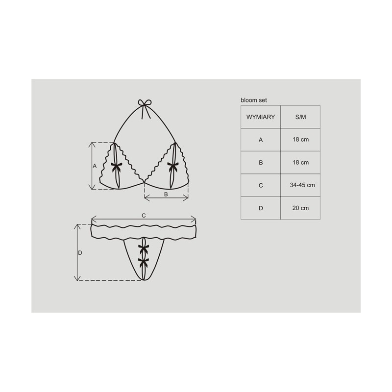 Dulce conjunto compuesto por un sujetador y tanga con lazos encantadores. Las copas están hechas de satén y están decoradas con lazos azules. Los bordes están hechos de encaje suave. La parte superior del tanga es en encaje y la parte inferior es de satén. El tanga y el sujetador tienen aberturas muy sensuales. Este producto es de la marca OBSESSIVE, una marca líder, llena de erotismo y sensualidad con modelos únicos que enaltecen aún más el cuerpo de las mujeres.