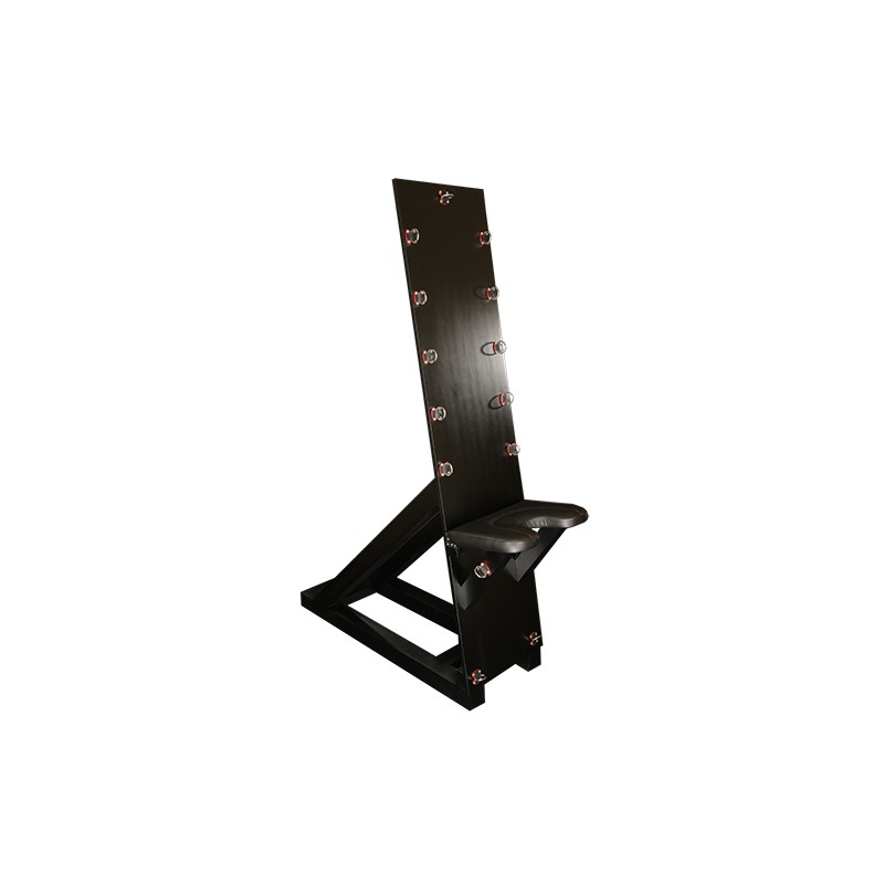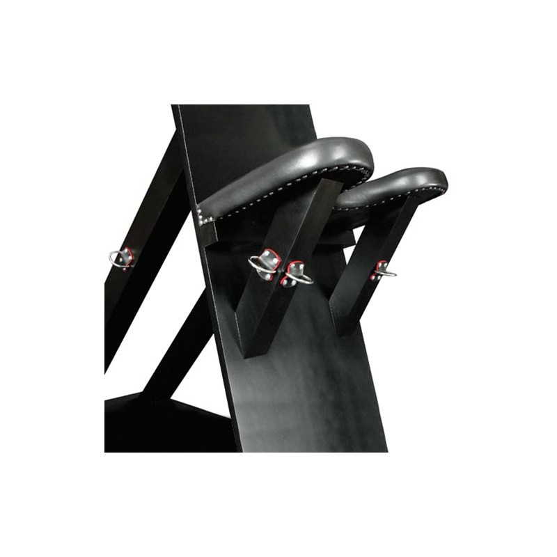 Una silla de madera de alta calidad, pintada de negro. El asiento está acolchado con piel de la más alta calidad. Contiene numerosos anillos en forma de D, para un uso más seguro y versátil. Con esta silla de la prestigiosa marca LEDAPOL puede castigar su esclavo de 1001 maneras. La imaginación es el límite.