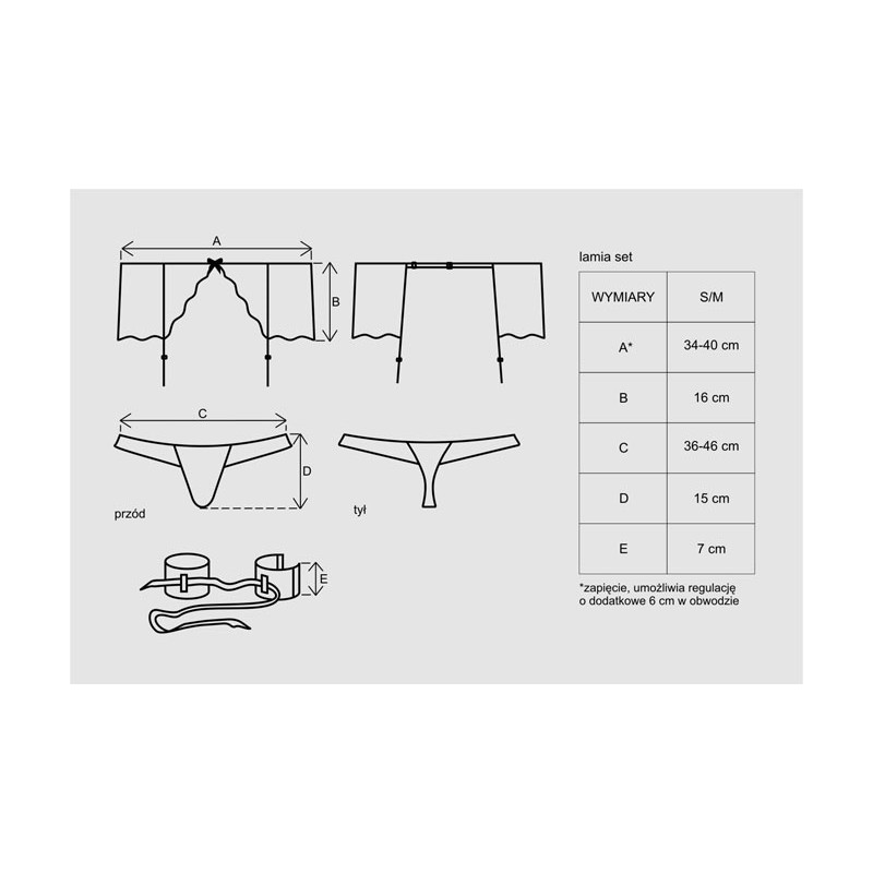 Este conjunto sensual y misterioso llamará la atención de cualquier hombre. El liguero tiene un design único y muy elegante, con ligas ajustables. Esposas que cierran en velcro con una banda satinada. Inclui un tanga a juego. Este producto es de la marca OBSESSIVE, una marca líder, llena de erotismo y sensualidad con modelos únicos que enaltecen aún más el cuerpo de las mujeres.