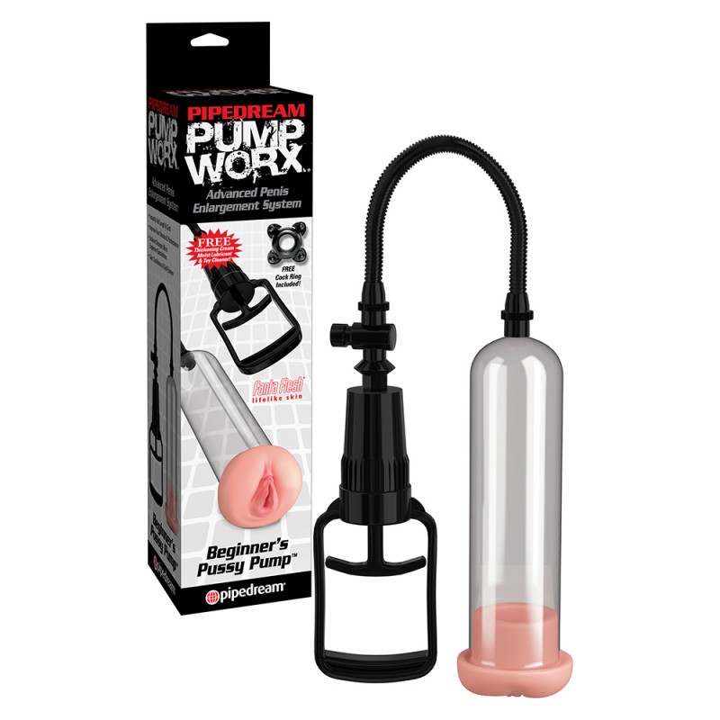 PUMP WORX BEGINNER'S PUSSY PUMP: What a better feeling than being able to develop your penis inside a realistic vagina? You can slip inside and start pumping until you see the results in front of your eyes! Guaranteed! The transparent cylinder allows you to see your penis grow and improve its performance! You can also use the enhancement ring to help maintain erections and prolong ejaculation. It is made from non-phthalate body-safe material. Includes free thickening cream, moist lubricant, toy cleaner and cock ring.