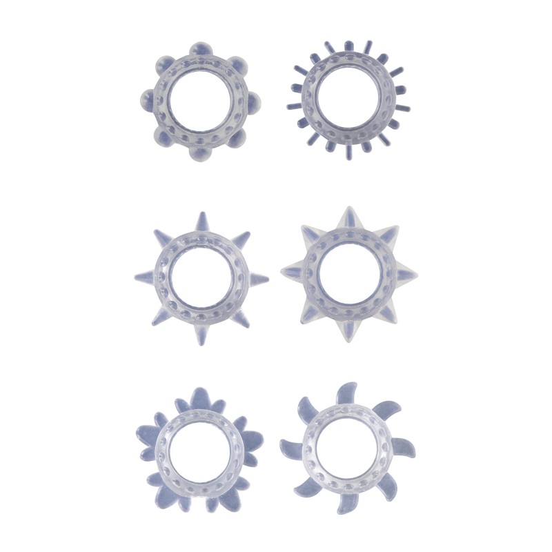 Have an amazing satisfying feeling with these incredible cockrings. Thanks to their fit they wont slip, and the pressure will give you strongest and longer erections. We're sure that your partner will thank you later. Intensify your nights! Made of 6 cock rings with different shapes.
