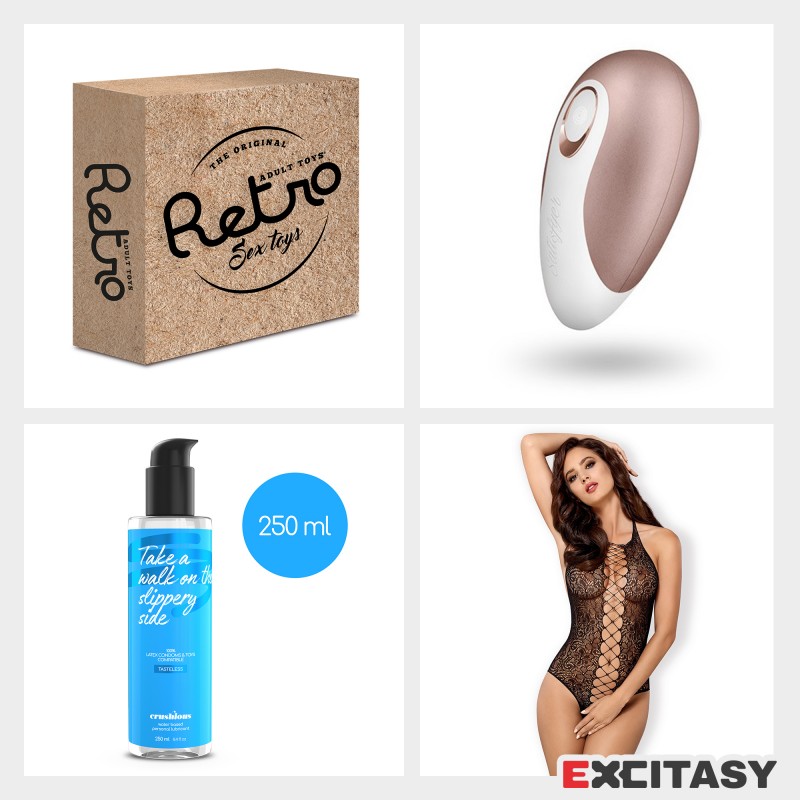 Pack made by Satisfyer Pro Deluxe, crotchless teddy and waterbased lubricant Crushious. All presented in a beautiful and classic box. Perfect for a surprise gift and a very special evening!