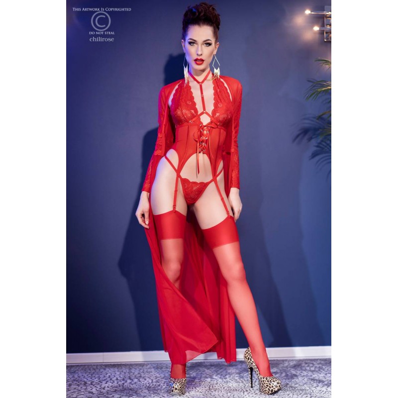 Stunning lace and red tulle corset with elegant satin ribbons. Are these arguments enough to fall in love? And we're just getting started. This corset is accompanied by a thong, garter stockings and a detachable choker. We thought of everything to complete your look.