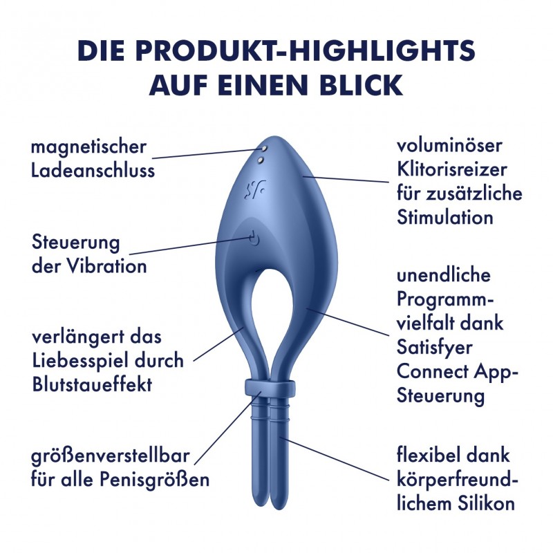 Satisfyer Bullseye has 12 vibration programs to pamper both partners with powerful vibes that are easy to control - the one-touch button on the front of the toy takes care of that. The free Satisfyer Connect app gives you even more freedom when playing - you can create your own vibration rhythms, link the vibrations of the penis ring to your Spotify account or control the toy worldwide via the Internet.
