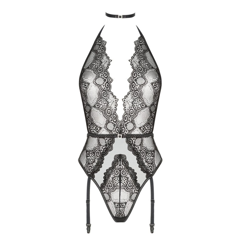 Un body en dentelle qui impressionne par son décolleté profond mettant en valeur le buste et une subtile imitation de sangle à la taille qui accentue la silhouette. L'ensemble comprend un élégant tour de cou avec une application brillante, qui ajoute un charme sophistiqué à l'ensemble. Un design à la fois délicat et sensuel, parfait pour les occasions spéciales.