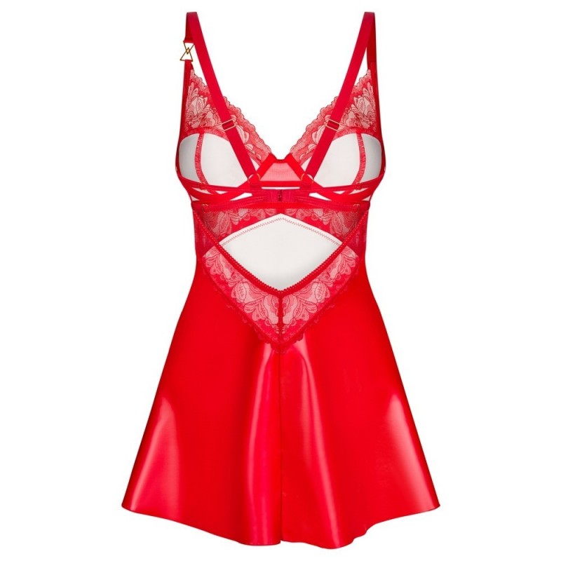 L'ensemble Aliosa d'Obsessive se compose d'une nuisette courte et évasée et d'un string. L'ensemble est d'un style séduisant et d'une couleur rouge sensuelle. Il est composé d'une belle matière brillante et lisse et d'une dentelle florale délicate et transparente. Il est également doux et extensible pour un ajustement très confortable. Un détail décoratif discret de couleur or se trouve entre les bonnets à armatures et sur l'une des bretelles du soutien-gorge. Les bretelles et la fermeture à crochet au dos peuvent être ajustées.