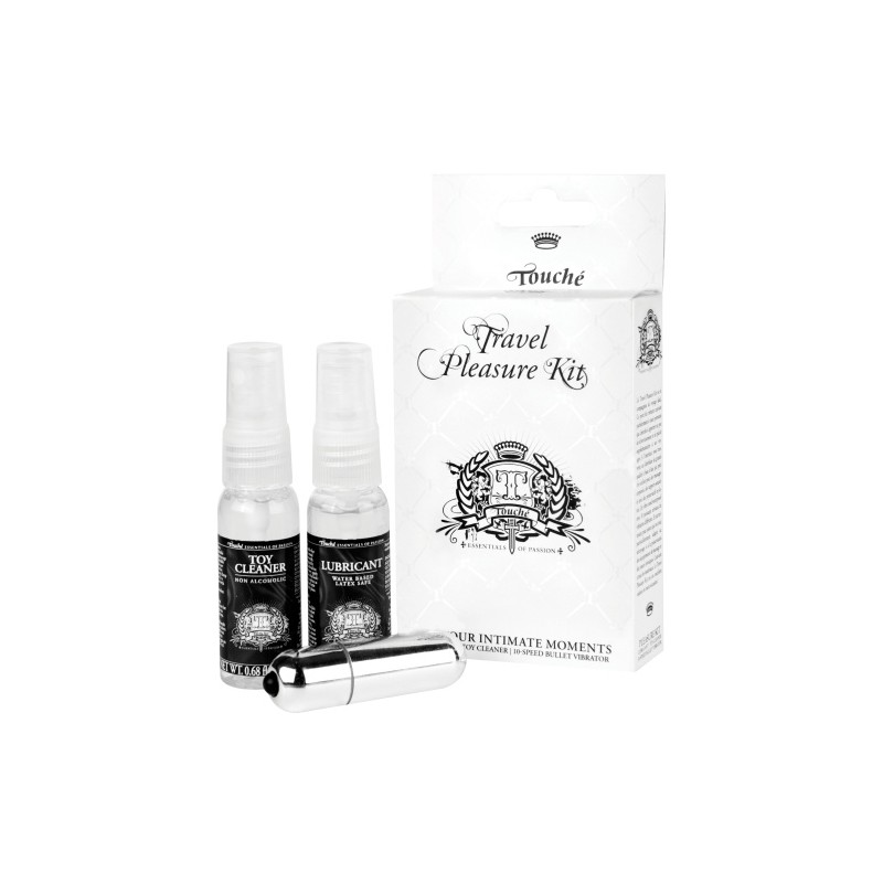 The TRAVEL PLEASURE KIT is the perfect companion on any trip. This small yet robust kit is perfect for anyone who is looking to add a little extra fun and pleasure into their travels. Inside you’ll find a high quality water-based lubricant, suitable for body massages, sexual intercourse and for use with latex condoms. A waterproof bullet vibrator with 10 different levels of powerful vibrations. And toy cleaner, especially suitable for cleaning and maintaining massage equipment and erotic toys. The TRAVEL PLEASURE KIT makes a great gift for any occasion!