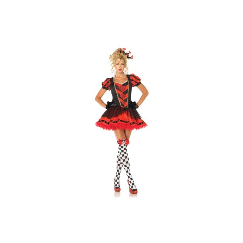 Have fun and and spice up your relationship, with this Dark Heart Queen costume. Presents a wonderful red and black dress, it has golden and black details, frills, hearts and an amazing matching crown. It also includes a red linning in the skirt. Gloves and thigh highs not included.