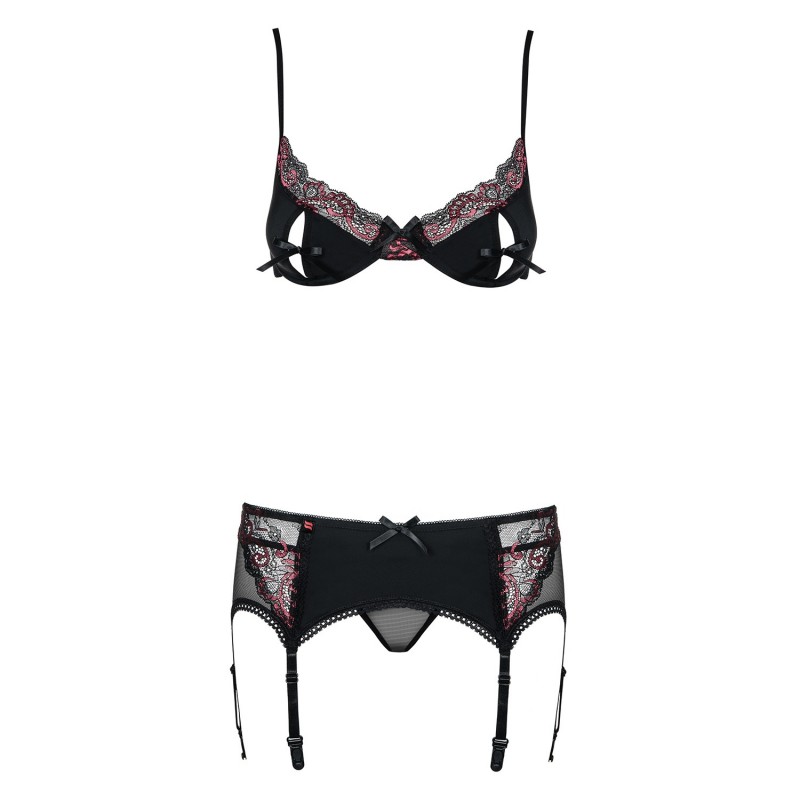 Explore your night and seduce with this set that will turn you irresistible. It is very simple and it stands out for its elegance. Only with some lace details, the red lace and the black clearness is in perfect symbioses with your body. Enjoy the daring side of worked lace on the neckline of the bra that also has a little black bow in the middle, and one in each boob, uniting an opening. Dazzle with a very garter belt, that is opaque only in the front, also with a little black satin bow and it has lace on the sides. Adjustable stripes and garters. Includes a matching thong. Dress the sensuality and originality and drive him crazy by desire. This is a product from OBSESSIVE, a leading brand filled with eroticism and sensuality with unique models that highlight the women body even more.