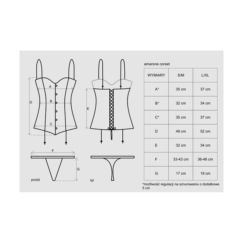 This elegant corset is decorated with floral details in pink lace. Its bones and the tight cut subtly sculpts your silhouette providing a defined and graceful waist. The garters are adjustable and detachable. Includes a matching thong. This is a product from OBSESSIVE, a leading brand filled with eroticism and sensuality with unique models that highlight the women body even more.