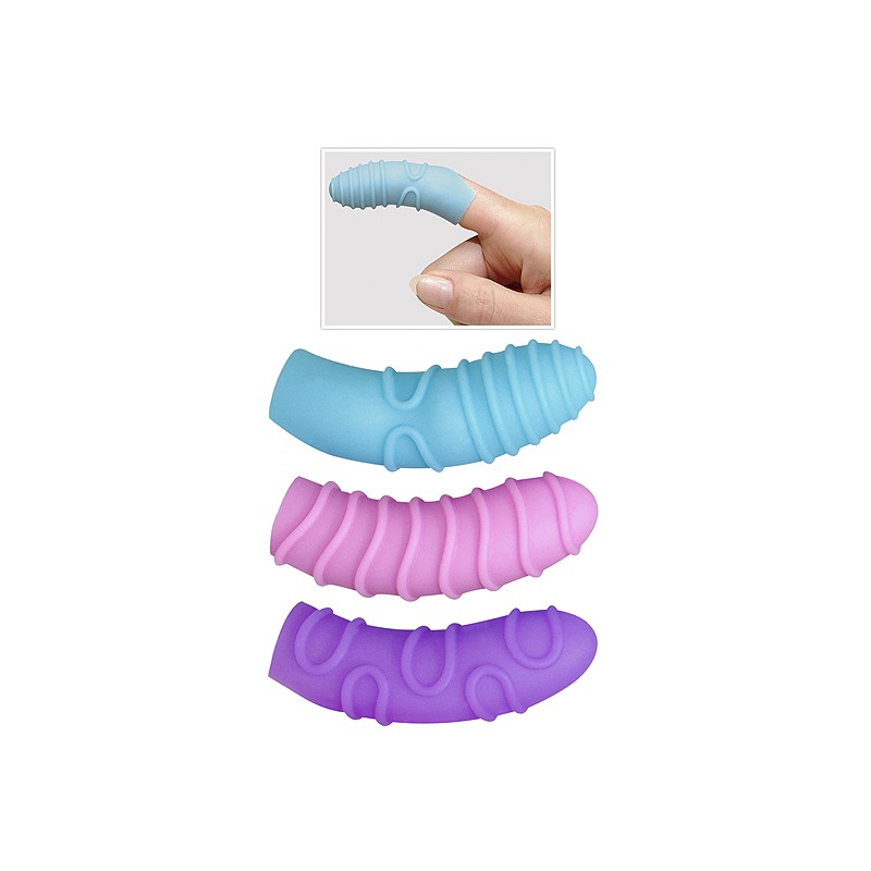 Dedeiras fabricadas em silicone suave macio e flexível, este kit contêm 3 dedeiras com diferentes estimuladores e são perfeitos para estimulação clitorial a só ou acompanhada.