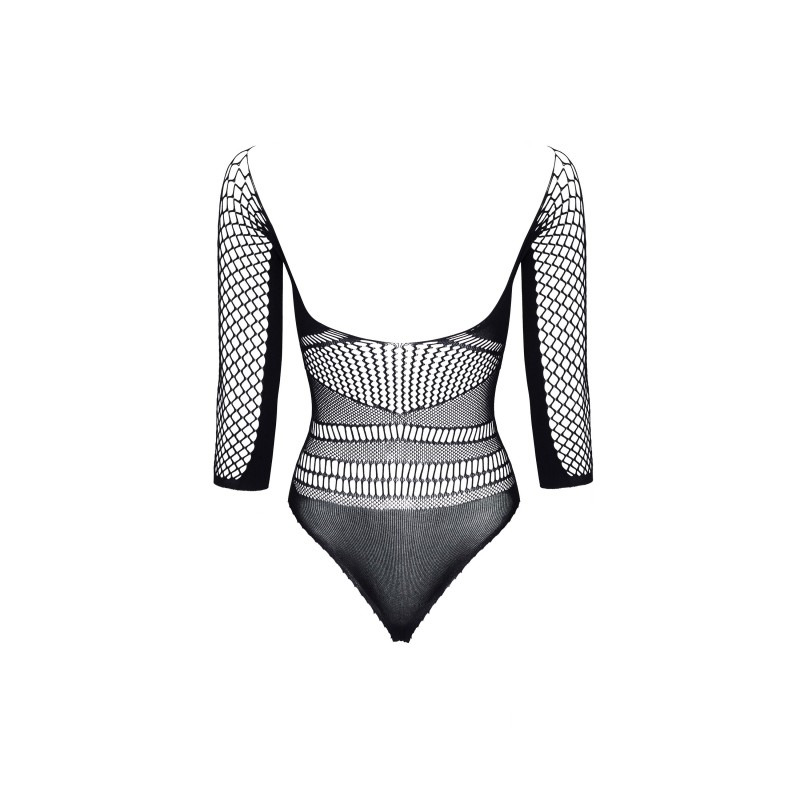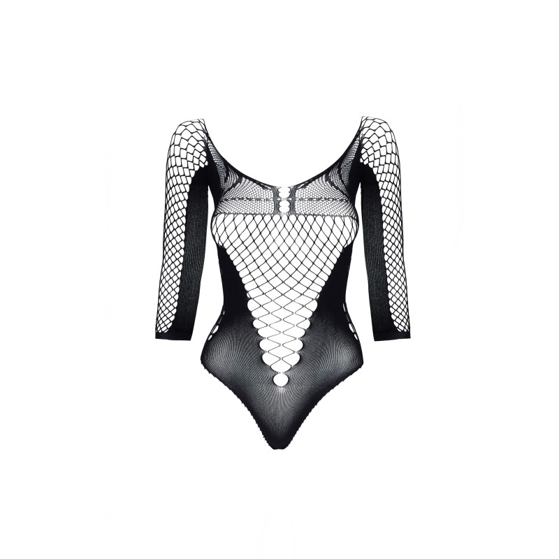 Body muito sexy feito de um material elástico delicado que se ajusta perfeitamente ao corpo. O decote profundo em rede dá um charme muito sensual. Body com mangas compridas, parte das cuecas fechada.
