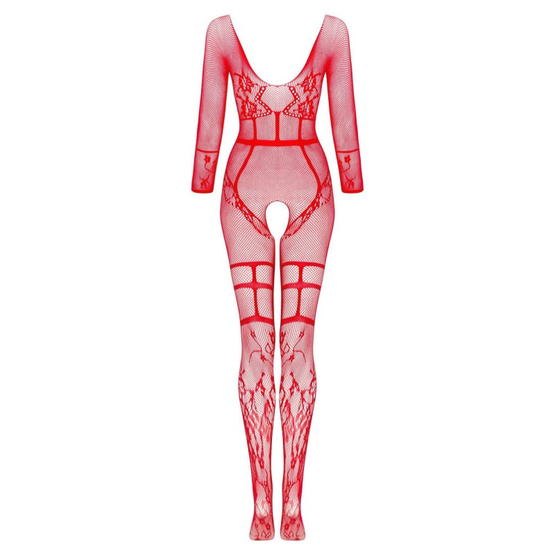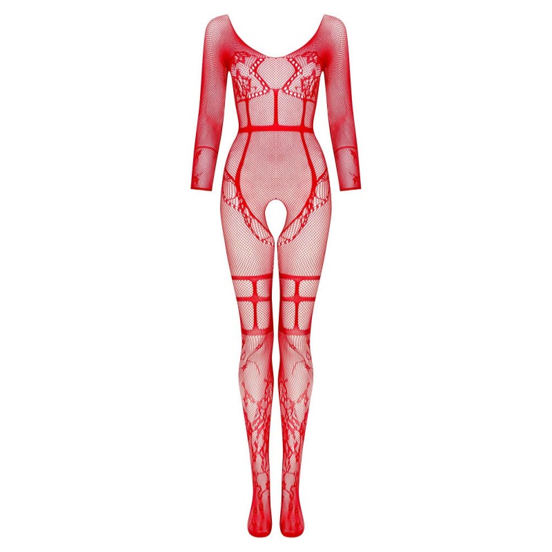 Um catsuit super sexy para os amantes de roupa interior confortável, feito de fio vermelho e delicado. O motivo em rede é complementado por impressionantes aplicações florais e tiras na cintura e nas coxas.