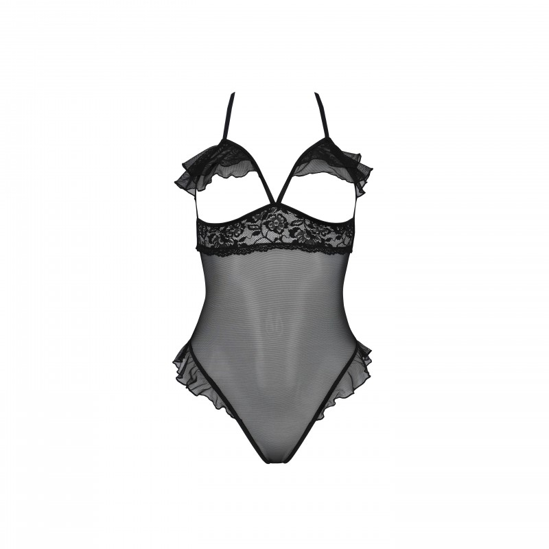 Body sensual em tule elástico com detalhes em renda e folhos, que realçam as curvas femininas de forma sofisticada.