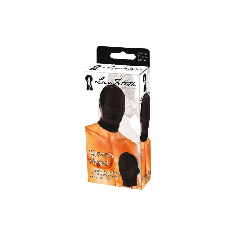 LUX FETISH STRETCH HOOD é uma máscara preta respirável e brilhante que bloqueia a luz, mas permite uma fácil respiração e audição!