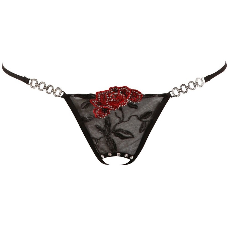 Tanga preta com uma provocante abertura e adornada por uma rosa vermelha com brilhantes. Possui aros com brilhantes nas laterais e uma fita que cria um efeito corpete na parte de trás da tanga.