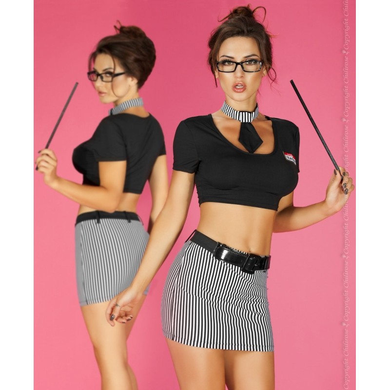 Para um sensual jogo de sedução, tem ao seu dispor esta fantasia de professora, que inclui os óculos, o top preto a saia às riscas, o cinto, a gravata pequena, a vara e a tanga a combinar, e tudo isto numa malha de toque macio.