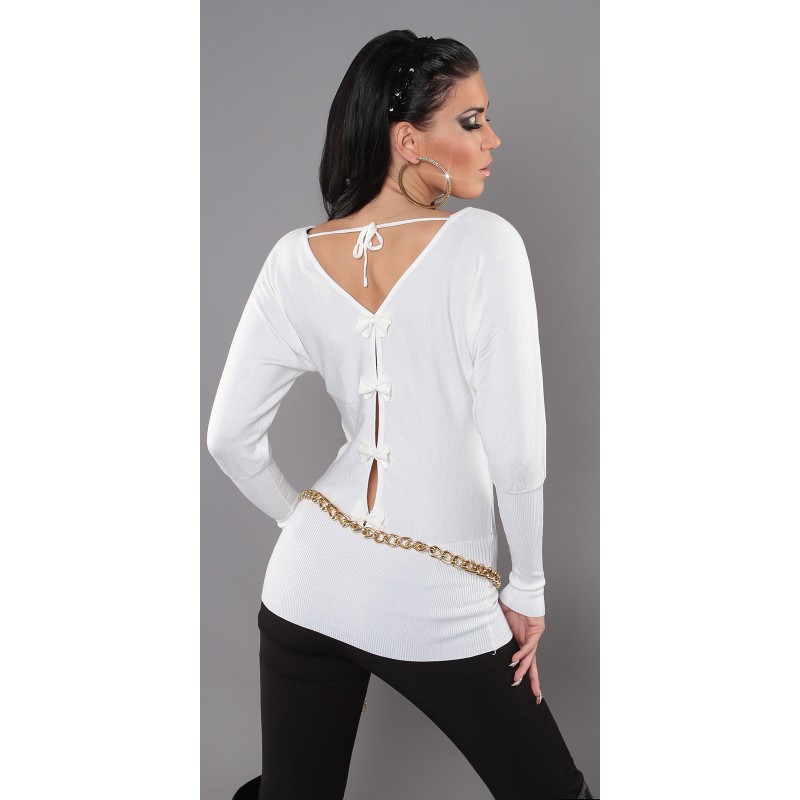 Camisola cor branco pérola de manga comprido, decote em forma de V. Sem costa, atras pormenor de laços pequenos.